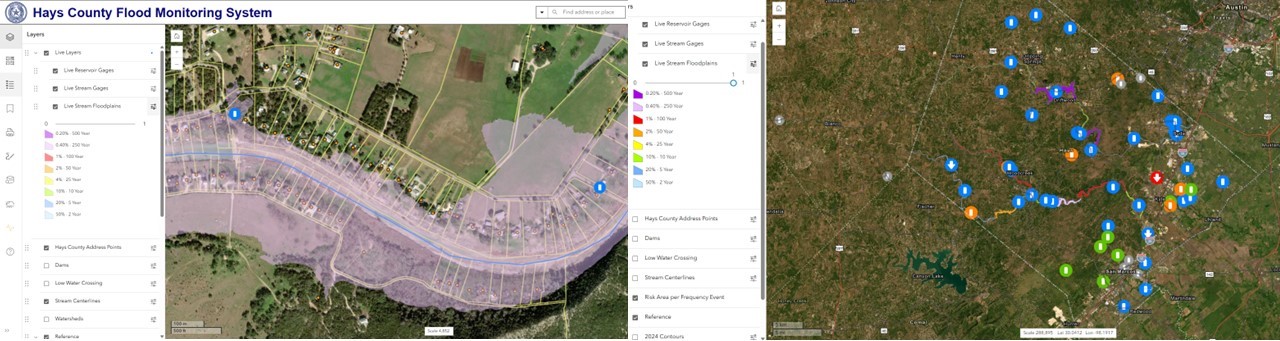 The Hays County FMS uses a secure web-map for emergency personnel that displays a real-time rainfall gage, stream gage, reservoir gage and radar data in combination with Hays County reference data, which includes boundaries (parcels, precincts, municipalities, ETJs and emergency services), 911 address points, risk areas, contours, best available static floodplains, dam breach floodplains and FEMA floodplains.