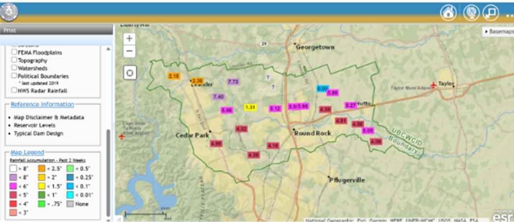 The Upper Brushy Creek (UBC) Water Control and Improvement District (WCID) Flood Monitoring System includes reservoir gages, precipitation gages, stream gages, alerting systems and visualization tools. The UBCWCID Flood Monitoring Map displays real-time precipitation gage, stream gage, reservoir gage and radar data in combination with district reference data such as watershed boundaries, inundation easements, contours, dams and two layers that symbolize layers based on real-time gage readings. Live reservoir gages include a coloring symbology representing the recorded elevation relative to spillway elevations, indicating level of risk. Live precipitation gages include a coloring system representing the amount of rainfall over a user-specified duration.