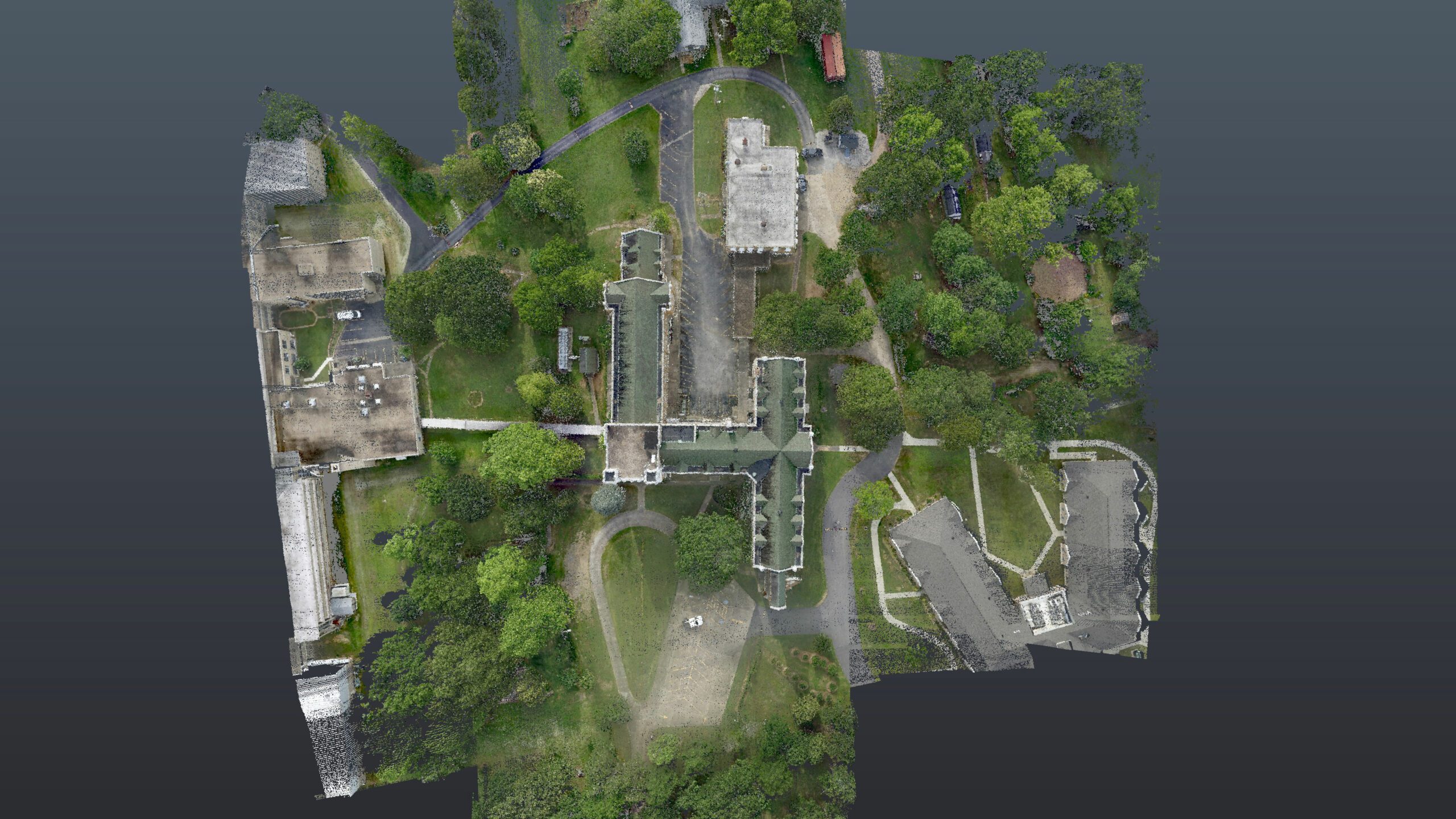 Aerial scanning is similar to TLS, but it is conducted above the ground from a drone or airplane. In the case of St. Scholastica, a drone captured the area from above. This allowed the Geospatial team to scan hard-to-reach places like the roof and the surrounding environment, such as vegetation and buildings.