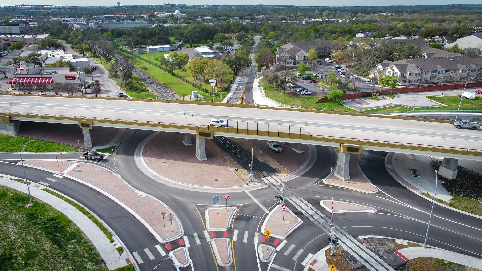 RM 620 had endured decades of traffic congestion caused by an at-grade railroad crossing and limited alternative routes. Slow-moving rock trains traveling from a nearby quarry would block traffic on RM 620, backing it up into an adjacent intersection with IH-35. The roadway serves commuters, area businesses, a residential neighborhood, places of worship, Round Rock High School and nearby Round Rock Medical Center, handling as much as 40,000 Average Annual Daily Traffic (AADT). An overpass and road widening were needed, but the area had fully developed with homes and businesses lining both sides of the corridor, so expanding to a full freeway section would have been highly disruptive and displaced dozens of businesses.